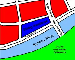 Mapa del área que rodeaba los almacenes. En azul, la guarnición de las tropas de la Armada Nacional Revolucionaria. En rojo, la zona controlada por las tropas de la Armada Imperial Japonesa. En verde, las concesiones extranjeras.