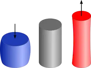 En la figura se puede ver que la carga de compresión (indicada por la flecha) ha provocado una deformación en el cilindro (color rojo), de modo que la forma original (color gris) se ha modificado (deformado) a un volumen con los lados abultados. Este fenómeno se produce porque el material, aunque lo suficientemente fuerte como para no agrietarse o romperse, no es lo suficientemente fuerte para soportar la carga sin cambios. Como resultado, el material se expande lateralmente. Las fuerzas internas (en este caso en ángulo recto con respecto a la deformación) equilibran la carga aplicada.