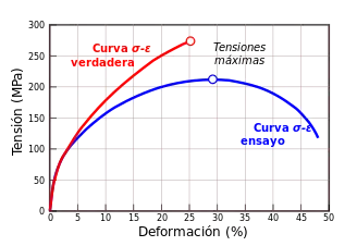 Además, basándose en la curva de tensión-deformación verdaderas, se puede estimar la región donde comienza a producirse el estrechamiento. Desde que comienza a aparecer un estrechamiento visible de la sección, hasta que se llega a la tensión final (cuando se aplicó la fuerza máxima), se puede expresar esta situación de la siguiente manera: