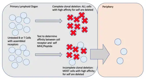 Los linfocitos B y T se prueban para determinar su afinidad por los complejos MHC/péptido propios antes de dejar los órganos linfoides primarios y entrar en la periferia. Si demuestran una alta afinidad por el autoantígeno, un método para prevenir la autoinmunidad es mediante la deleción clonal. Aquí es donde el linfocito recibiría señales apoptóticas de la célula presentadora de antígeno (APC).[2] Es importante señalar que no todos los linfocitos que expresan una alta afinidad por el autoantígeno experimentan una deleción clonal. Los linfocitos B también pueden participar en la edición del receptor de cadena ligera, el reemplazo del gen VH, o ser liberados y luego sufrir una selección negativa en la periferia.[3][5] En cambio, los linfocitos T pueden sufrir detención clonal, anergia clonal y edición clonal.[1] Si las células autorreactivas escapan a la deleción clonal en el timo o en la médula ósea, existen mecanismos en la periferia que involucran a las células T reguladoras para evitar que el huésped contraiga una enfermedad autoinmune. Sin embargo, tanto para las células B como para las células T en los órganos linfoides primarios, la deleción clonal es la forma más común de selección negativa.
