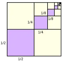 - Comprobamos de igual forma que la suma de todas las áreas de todos los cuadrados inscritos en el cuadrado de lado 1 es el área del mismo cuadrado. De esto se deduce que la suma de los cuadrados lilas correspondientes a la suma que nos ocupa es 1/3.