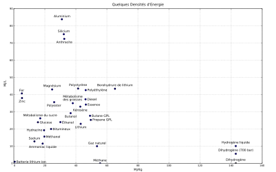 Las fuentes de energía de más alta densidad provienen de reacciones de fusión y de fisión. En razón de los límites generados, la fisión, se restringe a aplicaciones muy precisas, mientras que la fusión en continuo aún no ha sido totalmente dominada. El carbón, el gas y el petróleo son las fuentes de energía más utilizadas mundialmente, aún si tienen una densidad de energía mucho más débil; el resto se debe a la combustión de la biomasa, que tiene una densidad de energía todavía menor.