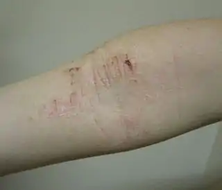 - Áreas gruesas o con apariencia de cuero, llamadas liquenización, lo cual puede ocurrir después de rascado o irritación prolongados
