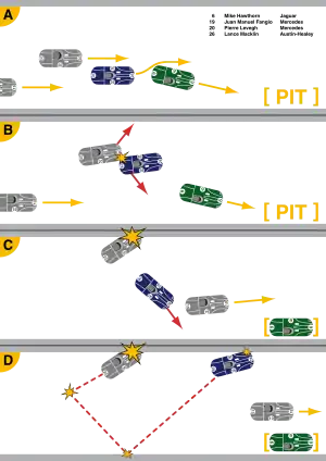 Hawthorn, en plena lucha con Juan Manuel Fangio, adelantó a un Austin Healey, conducido por el piloto británico Lance Macklin, a la entrada de la línea derecha de las tribunas pero, de repente, frenó y decidió entrar a los pits.