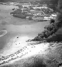![]() USS LST-39 y USS LST-480 todavía en llamas el 22 de mayo de 1944. | ||