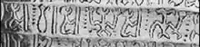 ), —, se repite 31 veces, cada vez seguida de una a media docena de glifos antes de su siguiente aparición. Creía que esto dividía el texto en secciones que contenían los nombres de los jefes.[39] Barthel luego encontró este patrón en la tableta K, que es una paráfrasis de Gr —en muchos de los K las secuencias del compuesto se reducen a 380.1 ![]()