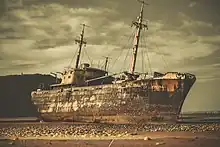 ![]() El Desdémona encallado en la playa de la zona del cabo San Pablo. | ||