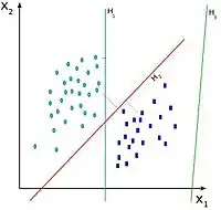 Una SVM construye un hiperplano o conjunto de hiperplanos en un espacio de dimensionalidad muy alta (o incluso infinita) que puede ser utilizado en problemas de clasificación o regresión. Una buena separación entre las clases permitirá un clasificación correcta.