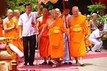 El templo también comenzó a organizar grandes donaciones de limosnas en todo el país.[77] Los eventos de donación de limosnas se llevaron a cabo para ayudar a unir a monjes y laicos a revivir la costumbre de dar limosna y como una dedicación de mérito a las víctimas de la insurgencia en las provincias del sur.[73][83][84] Las ganancias de los eventos de donación de limosnas se usaron para apoyar a los templos y maestros en el sur con ayuda y suministros.[85][84]