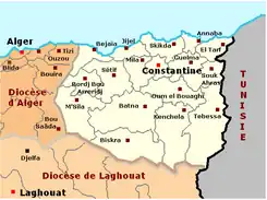 La diócesis extiende su jurisdicción sobre los fieles católicos de rito latino residentes en las siguientes provincias de Argelia: El Tarf, Annaba, Skikda, Jijel, Bugía, Souk Ahras, Guelma, Constantina, Mila, Bordj Bou Arréridj, Oum el-Bouaghi, Batna, Biskra, Tébessa, Jenchela, y parte de la provincia de M'Sila.
