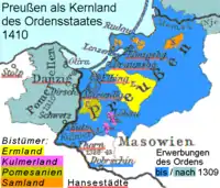 Después de la conquista de Sambia en 1255 por el rey Otakar II de Bohemia durante la cruzada prusiana y el establecimiento de la ciudad de Königsberg, la división de la diócesis de Sambia entre la Orden Teutónica y el obispo de Sambia se decidió en 1257. Primero acordaron una delimitación de los derechos respectivos en el área de la ciudad de Königsberg. El área posterior del casco antiguo de Königsberg quedó para la Orden Teutónica. En el año siguiente también se abordó la división del país. Mediante arbitraje del landmaster de Prusia Gerhard von Herzberga a partir del 3 de marzo de 1258 el área ya conquistada y poblada se dividió en varias partes, de las cuales el obispo tenía derecho a un tercio de la masa total. En 1352 hubo una segunda gran división entre religiosos y obispos, sobre el área de los nadruvianos. El tercio que fue otorgado al obispo de Sambia se encontraba al oeste de la futura ciudad de Insterburgo y al norte del río Pregolia.[2]