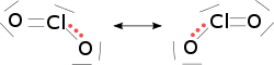 La molécula ClO2 tiene un número impar de electrones de valencia, y por tanto, es un radical paramagnético. Su estructura electrónica desconcertó mucho tiempo a los químicos porque ninguna de las posibles estructuras de Lewis es muy satisfactoria. En 1933, L. O. Brockway propuso una estructura que implicaba un enlace de tres electrones.[16] El químico Linus Pauling desarrolló posteriormente esta idea y de ahí llegó a dos estructuras resonantes que implicaban por un lado un doble enlace y por otro un enlace simple más uno de tres electrones.[17] Según Pauling, la última combinación debería representar un enlace ligeramente más débil que el doble. En la teoría de orbitales moleculares esta es una idea frecuente, si el tercer electrón está situado en un orbital antienlazante. Estudios posteriores han confirmado que el orbital molecular más alto ocupado es, de hecho, un orbital antienlazante incompleto.[18]
