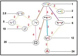![]() Grupos de Coxeter en el espacio 3d con sus diagramas. Los espejos (caras triangulares) están etiquetados por el vértice opuesto 0..3. Las ramas se colorean por su orden de reflexión. llena 1/48 del cubo. llena 1/24 del cubo. llena 1/12 del cubo. |