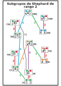 Los grupos de Shephard de rango 2 son: 2[q]2, p[4]2, 3[3]3, 3[6]2, 3[4]3, 4[3]4, 3[8]2, 4[6]2, 4[4]3, 3[5]3, 5[3]5, 3[10]2, 5[6]2, y 5[4]3; o ![]()