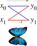 El diagrama de mariposa muestra un diagrama de flujo de datos conectando las entradas x (a la izquierda) y productos que dependen de ellos (a la derecha) para una "mariposa" paso de una base-2 Cooley-Tukey FFT. Este diagrama se asemeja a una mariposa como en la mariposa Morpho muestra para la comparación), de ahí el nombre.