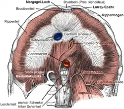 El diafragma se inserta en el centro frénico o espejo de Van Helmont (llamada así porque tiene un color anacarado). Tiene un orificio (el hiato de la vena cava caudal).