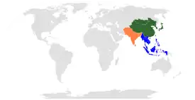 - El área de influencia occidental está formada por los países que han adoptado o se han visto influidos por la cultura, la lengua, el sistema político, la religión, el modo de vida o el sistema de escritura occidentales. Algunos ejemplos notables son Hong Kong, India, Israel, Japón, Macao, Mongolia, Singapur, Vietnam, el archipiélago malayo, las islas del Pacífico y la mayoría de los países del África subsahariana. Ocasionalmente, incluso países como Corea del Sur, Taiwán y la mayoría de los países de Oriente Medio y el norte de África se han considerado parte del área de influencia occidental.