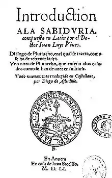- Introduction a la sabiduría, compuesta en Latín por el Doctor Juan Luys Vives. Diálogo de Plutarcho, en el qual se tracta, como se ha de refrenar la ira. Una carta de Plutarcho, que enseña a los casados como se han de aver en su bivir. Todo nuevamente traduzido en Castellano, por Diego de Astudillo, en Anvers. En casa de Juan Steelsio, M.D.LI [1551]. Biblioteca Nacional de España, U/8869.[5]
