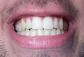 Los dientes, ordenados desde el centro hacia las mandíbulas son: incisivos que cortan, los caninos que desgarran, los premolares que trituran y los molares que muelen.[2][3][4][5][6][7]