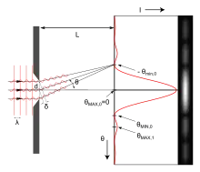 En física clásica, el fenómeno de difracción está descrito por el Principio de Fresnel - Huygens que trata a cada punto en el frente de una onda propagadora como un grupo de ondículas esféricas individuales.[1] El patrón de interferencia característico es más marcado cuando una onda de una fuente coherente (como un láser) se encuentra a una rendija/abertura que es comparable en tamaño a su longitud de onda, como es mostrado en la imagen insertada. Esto se debe a la adición, o interferencia, de los diferentes puntos en el frente ondulatorio (o, equivalentemente, de cada ondícula) que viajan por trayectorias de diferentes longitudes a la superficie de registro. Sin embargo, si son múltiples aberturas muy cercanas, pueden resultar en un patrón complejo de intensidad variable.