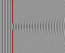 Una rendija larga de ancho infinitesimal que está iluminada por luz, la difracta en una serie de ondas circulares y el frente de onda que emerge de la hendidura es una onda cilíndrica de intensidad uniforme, acorde con el principio de Huygens-Fresnel.
