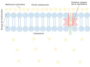 Las moléculas polares y los iones grandes disueltos en agua no pueden difundirse libremente a través de la membrana plasmática debido a la naturaleza hidrófoba de las colas de ácidos grasos de los fosfolípidos que componen la bicapa lipídica. Solo las moléculas pequeñas no polares, como el oxígeno y el dióxido de carbono, pueden difundirse fácilmente a través de la membrana. Por lo tanto, las moléculas polares pequeñas son transportadas por proteínas en forma de canales transmembrana. Estos canales están cerrados, lo que significa que se abren y cierran y, en consecuencia, desregulan el flujo de iones o pequeñas moléculas polares a través de las membranas, a veces en contra del gradiente osmótico. Las moléculas más grandes son transportadas por proteínas transportadoras transmembrana, como las permeasas, que cambian su conformación a medida que las moléculas son transportadas (por ejemplo, la glucosa o los aminoácidos). Las moléculas no polares, como el retinol o los lípidos, son poco solubles en agua. Se transportan a través de los compartimentos acuosos de las células o a través del espacio extracelular mediante transportadores solubles en agua (por ejemplo, la proteína de unión al retinol). Los metabolitos no se alteran porque no se requiere energía para la difusión facilitada. Solo la permeasa cambia de forma para transportar metabolitos. La forma de transporte a través de una membrana celular en la que se modifica un metabolito se denomina transporte de translocación de grupo.