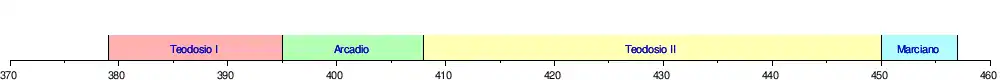 | 2. Pulqueria | Marciano (r. 450-457) | 1. Esposa | Arcadia | Elia Eudocia | Teodosio II el Calígrafo (r. 408-450) | ||||||||||||||||||||||||||||||||||||||||||||||||||||||||||||||||||
