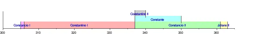 | Constantino II (r. 337-340) | Constante (r. 337-350) | ||||||||||||||||||||||||||||||||||||||||||||||||||||||||||||||||||||||||||||||||||||||||||||||||||