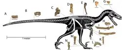 ![]() Recreación del esqueleto, mostrando los elementos conocidos en blanco. | ||