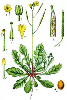 Es una planta erecta que raramente alcanza 50 cm de altura. Tiene las hojas lobuladas y las cimas de sus tallos se encuentran cubiertas de densas inflorescencias de color amarillo y ocasionalmente de color púrpura desvaído. Las flores tienen pequeños pétalos ovales y grandes estambres. El fruto es una silicua de dos a cuatro centímetros de largo.