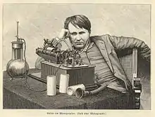 En 1877, Thomas Alva Edison inventó el fonógrafo. A diferencia del fonoautógrafo, podía grabar y reproducir sonido. A pesar de la similitud del nombre, no hay evidencia documental de que el fonógrafo de Edison se basara en el aparato de Scott. Edison primero intentó grabar sonido en una cinta de papel impregnada de cera, con la idea de crear un «repetidor telefónico» análogo al repetidor telegráfico en el que había estado trabajando. Aunque los resultados visibles le hicieron confiar en que el sonido se podía grabar y reproducir físicamente, sus notas no indican que realmente reprodujera el sonido antes de su primer experimento en el que utilizó una lámina de estaño como medio de grabación varios meses después. El papel de estaño se envolvía alrededor de un cilindro de metal ranurado y una aguja que vibraba movida por las ondas sonoras marcaba la lámina de estaño mientras el cilindro giraba. La grabación se podía reproducir inmediatamente. El artículo de la revista Scientific American que presentaba el fonógrafo de lámina de estaño al público, mencionaba los inventos anteriores de Marey, Rosapelly y de Barlow, así como el de Scott, citándolos como creadores de dispositivos para grabar pero, lo que era más importante, no para reproducir sonido.[12] Edison también inventó variaciones del fonógrafo que usaba cinta. y formatos de disco.[13] Se imaginaron numerosas aplicaciones para el fonógrafo, pero aunque se puso de moda como una novedad sorprendente en las demostraciones públicas efectuadas, el fonógrafo de lámina de estaño resultó demasiado tosco para ser utilizado en la práctica. Una década más tarde, Edison desarrolló un fonógrafo muy mejorado que usaba un cilindro de cera hueco en lugar de una lámina de estaño. Este resultó ser un dispositivo con mejor sonido y mucho más útil y duradero. El cilindro de fonógrafo de cera creó el mercado del sonido grabado a finales de la década de 1880 y lo dominó durante los primeros años del siglo XX.