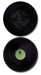 Los discos planos fueron desarrollados en los Estados Unidos por Emile Berliner (aunque la patente original de Thomas Edison incluía este tipo de discos), quien llamó a su sistema el «gramófono», distinguiéndolo del «fonógrafo» de cilindro de cera de Edison y del cilindro de cera del «grafófono» de la American Graphophone. Los primeros discos de Berliner, comercializados a partir de 1889 inicialmente solo en Europa, tenían 12,5 cm (aproximadamente 5 pulgadas) de diámetro y se tocaban con una pequeña máquina accionada manualmente. Tanto los discos como la máquina eran adecuados solo para su uso como juguete o curiosidad, debido a la limitada calidad del sonido. En 1894, bajo la marca Berliner Gramophone, Berliner comenzó a comercializar en los Estados Unidos discos de 7 pulgadas de diámetro con una calidad sonora bastante mejorada, junto con gramófonos algo más perfeccionados para reproducirlos. A pesar de ello, su sonido era todavía deficiente en comparación con los cilindros de cera, hasta que el socio de Berliner en la fabricación de discos, Eldridge R. Johnson, los pudo mejorar considerablemente. Abandonando la marca registrada «Gramophone» de Berliner por razones legales, a partir de 1901 las empresas separadas de Johnson y de Berliner acabarían reorganizándose para formar la Victor Talking Machine Company en Camden (Nueva Jersey), cuyos productos llegarían a dominar el mercado durante muchos años.[14] Emile Berliner trasladó su empresa a Montreal en 1900. La fábrica, que se convirtió en la sucursal canadiense de RCA Records, todavía existe. Hay un museo dedicado a Berliner en Montreal (el Musée des ondes Emile Berliner).