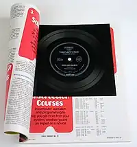 - Los flexidiscos de 7" a 33 RPM se utilizaron ocasionalmente como insertos en libros que incluían suplementos de audio. Consistían en grabaciones de LP que se podían fabricar muy delgadas, utilizando láminas flexibles de vinilo (o de papel laminado). Al menos se llegó a publicar una "revista" con una encuadernación en espiral, que incluía un agujero perforado en el centro a través de toda la revista, y con cuatro o cinco de estas grabaciones flexibles incluidas en la misma.