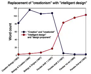 Aunque la frase "diseño inteligente" había aparecido previamente en las discusiones teológicas del argumento del diseño,[12] la primera publicación del término diseño inteligente en su uso actual como un término alternativo para el creacionismo fue en Of Pandas and People (Sobre pandas y personas),[13][14] un libro de texto de 1989 destinado a las clases de biología de secundaria. El término fue sustituido en los borradores del libro después del fallo en 1987 de la Corte Suprema de los Estados Unidos en el caso Edwards contra Aguillard, que prohibió la enseñanza de la ciencia de la creación en las escuelas públicas sobre fundamentos constitucionales.[15] A partir de mediados de la década de 1990, el movimiento del diseño Inteligente, apoyado por el Discovery Institute,[16] abogó por la inclusión del diseño inteligente en el currículo de biología de las escuelas públicas.[8] Esto condujo al caso de 2005 Kitzmiller contra el Distrito Escolar del Área de Dover en el que el juez de distrito de los Estados Unidos John E. Jones III, dictaminó que el diseño inteligente no es ciencia, que «no puede desacoplarse de sus creacionistas, y por tanto religiosos, antecedentes» y que su promoción por el distrito escolar por lo tanto violó la Cláusula de Establecimiento de la Primera Enmienda de la Constitución de los Estados Unidos,[17]