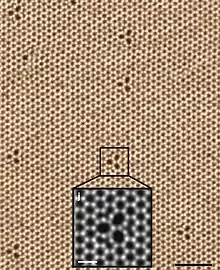 Imagen atómica de una monocapa de WSe2 que muestra simetría hexagonal y defectos triples. Barra de escala: 2 nm (0,5 nm en el recuadro).[9]