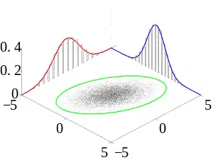 | Muchas observaciones de muestras (en negro) se observan a partir de una distribución de probabilidad conjunta. También se muestran las densidades marginales. |