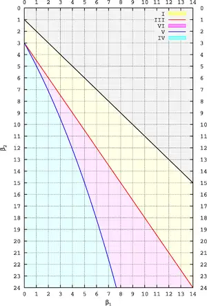 Diagrama del Sistema de Pearson, mostrando distribuciones de los tipos I, III, VI, V, y IV en términos de β1 (asimetría cuadrada) y β2 (curtosis tradicional)