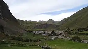 ![]() Distrito de Queropalca y su núcleo urbano visto desde el mirador y al fondo la Cordillera Huayhuash.