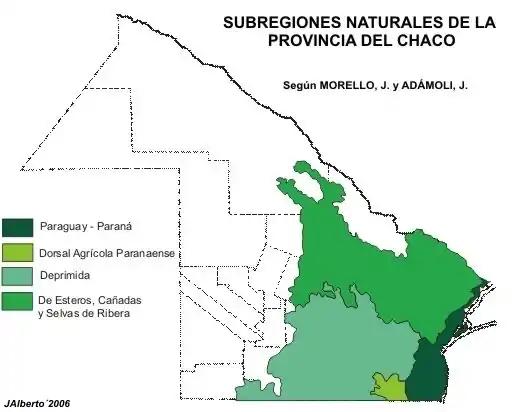 Especialmente si tenemos en cuenta las fisonomías o paisajes vegetales dominantes, que se perciben a simple vista y que resultan de la influencia combinada de los factores climáticos, topográficos y edáficos, esta región se corresponde en gran parte con la que Morello, J. y Adámoli, J. (1974) denominan el Chaco de esteros, cañadas y selvas de ribera y Paraguay-Paraná, y que en su trabajo sobre grandes unidades de vegetación y ambiente (GUVA), diferencian las siguientes subregiones: