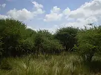 La vegetación se presenta en su estado clímax como un alto bosque de características xerófilas y caducifolias, dominano por elementos espinosos o de hojas muy pequeñas, de unos 15 a 20 metros de altura, y con árboles con diámetros mayores a un metro. Este estado es ya raro de encontrar por el daño que sufrió el distrito desde la época de la conquista a causa de incendios, tala, y avance de la frontera agropecuaria. En los bosques que se han mantenido en pie se presenta como una foresta abierta, de uno o raro dos estratos arbóreos de diez metros de altura o aún menos, con un estrato arbustivo, y otro herbáceo. Alternan con los bosques, estepas arbustivas, y graminosas.