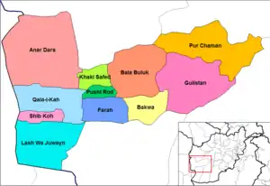 Esta es una lista de distritos de Afganistán, conocidos como wuleswali (en pastún: ولسوالۍ, wuləswāləi; en persa: شهرستان, shahrestān). Estas son unidades administrativas de nivel secundario, un nivel por debajo de las Provincias de Afganistán. El gobierno afgano publicó su primer mapa de distrito en 1973.[1][2] Reconoció 325 distritos, contando wuleswalis (distritos), alaqadaries (subdistritos) y markaz-e-wulaiyat (distritos del centro provincial).[2] En los años siguientes se agregaron distritos adicionales mediante divisiones y algunos se eliminaron mediante fusiones. En junio de 2005, el gobierno afgano publicó un mapa de 398 distritos.[3] Fue ampliamente adoptado como por muchos sistemas de gestión de la información, aunque generalmente con la adición de Sharak-e-Hayratan para un total de 399 distritos. Aquí hay un enlace a una representación limpia de el distrito 399 configurado como una hoja de cálculo (enlace roto disponible en Internet Archive; véase el historial, la primera versión y la última). de una fuente oficial afgana.[4] Sigue siendo el estándar de facto, a finales de 2018, a pesar de una serie de anuncios gubernamentales sobre la creación de nuevos distritos.