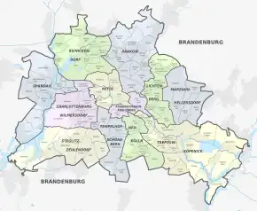 Berlín es una ciudad y uno de los estados federales de Alemania (véase ciudad-estado). Desde la reforma administrativa de 2001, se divide en doce distritos (en alemán: Bezirke, pronunciado bəˈʦɪʁkə), cada uno con su gobierno local, aunque todos los distritos están sujetos al gobierno de la ciudad y el estado de Berlín.