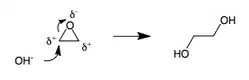 En una apertura del anillo, la molécula dividida se mantiene como una sola unidad.[5] El enlace se rompe, pero los dos fragmentos permanecen unidos por otras partes de la estructura. Por ejemplo, un anillo de epóxido puede abrirse por una división heterolítica de uno de los enlaces polares carbono-oxígeno para dar lugar a una única estructura acíclica.[5]