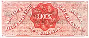 - La palabra "Dixie" se refiere a la moneda emitida por los Banco Estatal de los Ciudadanos en el Barrio francés de Nueva Orleans y, a continuación, por otros bancos en Louisiana.[15] Estos bancos emitieron billetes de diez dólares[16] con la etiqueta Dix en el reverso, el término francés para "diez". Las notas eran conocidas como "Dixies" por los sureños, y el área alrededor de Nueva Orleans y el área de habla francesa partes de Louisiana llegó a ser conocido como "Dixieland". Finalmente, el uso del término se amplió para referirse a los estados del Sur en general.