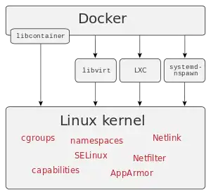 El soporte del kernel Linux para los espacios de nombres aísla la vista que tiene una aplicación de su entorno operativo,[3] incluyendo árboles de proceso, red, ID de usuario y sistemas de archivos montados, mientras que los cgroups del kernel proporcionan aislamiento de recursos, incluyendo la CPU, la memoria, el bloque de E/S y de la red. Desde la versión 0.9, Docker incluye la biblioteca libcontainer como su propia manera de utilizar directamente las facilidades de virtualización que ofrece el kernel Linux, además de utilizar las interfaces abstraídas de virtualización mediante libvirt, LXC (Linux Containers) y systemd-nspawn.[4][5][6]
