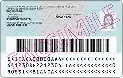 ![]() ![]() Anverso y reverso de ejemplar del documento de identidad italiano del tamaño de una tarjeta de crédito emitido desde el 4 de julio de 2016. | ||