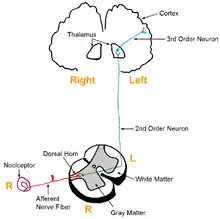 Las neuronas del asta dorsal de la médula espinal dan lugar al tracto espinotalámico (TET), el cual constituye la principal vía nociceptiva ascendente. Como consecuencia de la actividad espontánea en curso resultante en la periferia, las neuronas del TET desarrollan una mayor actividad de fondo, agrandamiento de los campos receptivos y respuestas mayores a los impulsos aferentes, incluyendo estímulos táctiles que normalmente son inocuos. Este fenómeno se denomina sensibilización central. La sensibilización central es un importante mecanismo del dolor neuropático persistente.