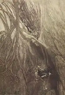 Las Doncellas del Rin, unos de los personajes de El anillo de los nibelungos, no proceden de la Edda poética o Edda prosaica, fuentes islandesas de la mayor parte de la mitología nórdica.[2] Las ninfas acuáticas (en alemán: Nixen) aparecen en muchos mitos y leyendas europeos, a menudo, aunque no invariablemente, en forma de maldad disfrazada. Wagner se inspiró ampliamente en esas leyendas al compilar la narración de su Anillo, y el origen probable de sus Rinemaidens está en el Cantar de los nibelungos alemán.[3] En una parte de la narración del Cantar, Hagen y Gundahario se encuentran con ciertas sirenas o duendes del agua (en alto alemán medio: merwîp;[4] en alemán moderno: Meerweib) que se bañan en las aguas del Danubio. Hagen les roba sus ropas, y buscando su regreso, la sirena llamada Hadeburg da la falsa profecía de que Hagen y Gunther encontrarán honor y gloria cuando entren en el reino de Etzel. Pero más tarde otra sirena, Sigelinde (nombre que Wagner volvería a adoptar para utilizarlo en otros lugares), le dice a Hagen que su tía ha mentido. Si van a la tierra de Etzel, morirán allí.[lower-alpha 1][5][6][7][8]
