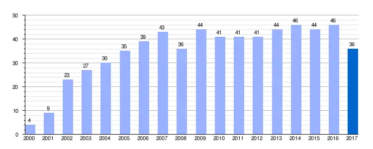 | Gráfica de evolución demográfica de Dordóniz entre 2000 y 2017 |