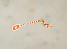 Tienen la boca en forma de tubo, ensanchando algo la cabeza y el cuerpo, que conforman una horizontal, rematada por una distintiva aleta caudal, más grande y ovalada, de color blanco, con un anillo rojo en el centro. El cuerpo es color blanco a crema, con rayas verticales de igual ancho e igualmente espaciadas, de color marrón oscuro, casi negro, en ocasiones rojizo, que se extienden también a la cabeza y el hocico.[3]